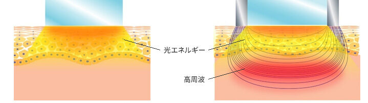 さらにRF(高周波)を加えることで、真皮組織の温熱効果が得られます。温熱効果を受けた真皮組織は、コラーゲン産生が促進します。その結果、徐々に肌の弾力、毛穴、小ジワなどに効果が現れてきます。