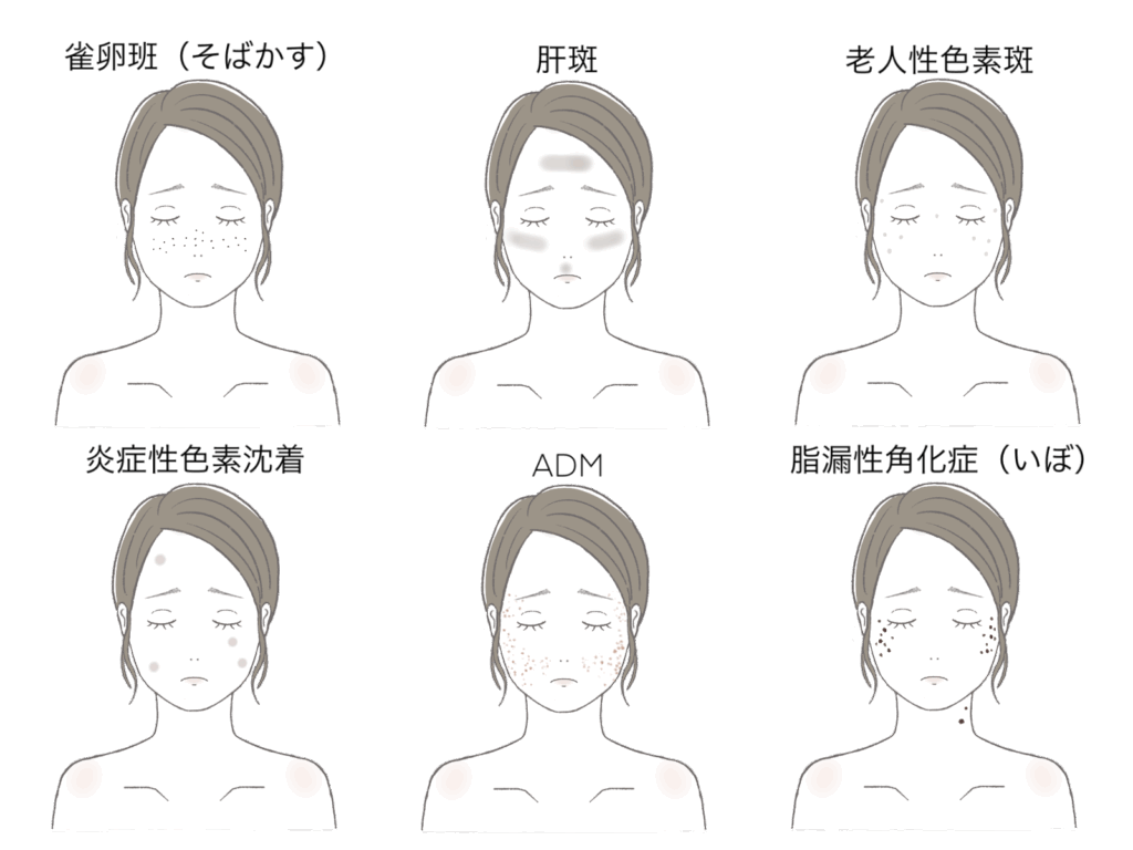 シミとは、メラニン色素の局所的な増加です。紫外線・ホルモンバランス・食生活・不規則な生活スタイルなどの要因によって、シミやくすみは発生じます。シミ・くすみは一言で呼ばれていますが、実はいくつもの種類があります。シミ・くすみの治療をする場合は、それぞれのシミ・くすみにあった方法で治療することが重要となります。