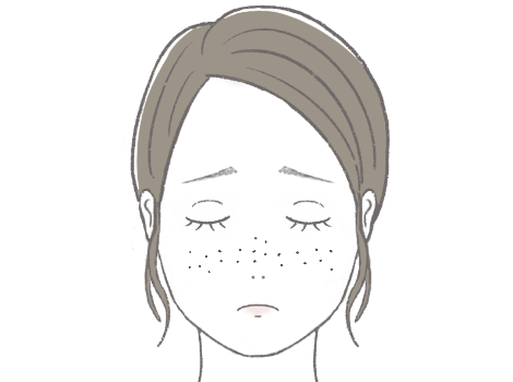 学童期に発症し、1mm~数mmの褐色班です。両頬~鼻にかけて散在し、手の甲・デコルテ・肩・背中にもできることがあります。紫外線で濃くなるのも特徴で、色白で乾燥肌の方によく見られます。