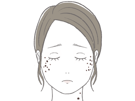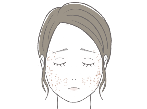 頬・こめかみ・鼻・まぶた・額などに両側性に現れる灰褐色のシミです。雀卵斑(ソバカス)に似ていますが、成人になってから出現する事が多く、雀卵斑(ソバカス)より少し大きいのが特徴です。
