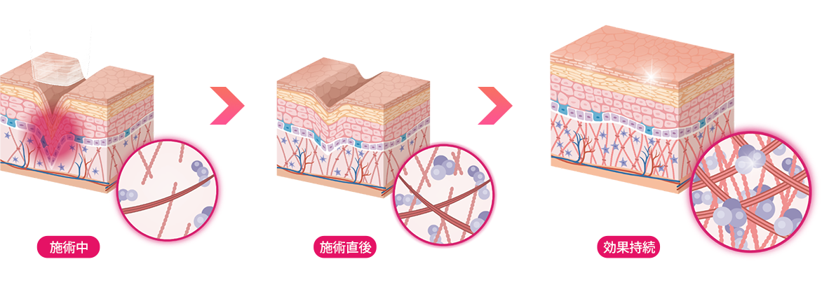 1回目から真皮層にある繊維芽細胞を刺激し自身の治癒・再生能力により新しいコラーゲンが生成されるためハリ、シワを改善し若々しい肌が得られます