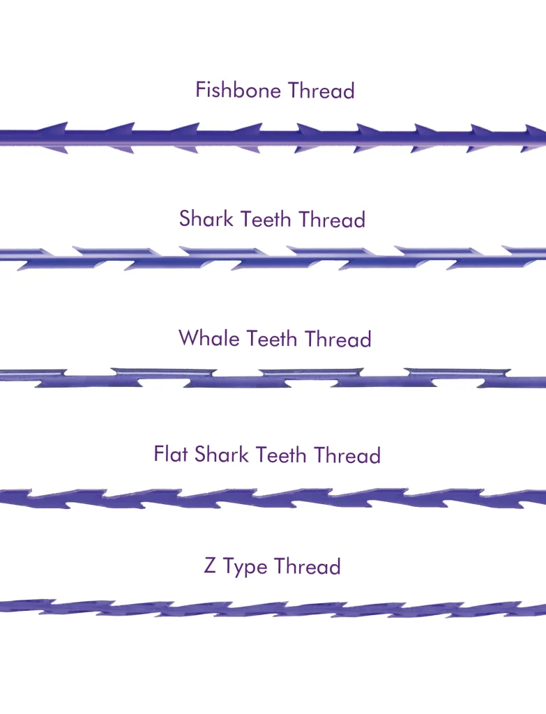 当院では、たるみの状態やご希望に合わせて複数種類の糸を使い分けています。ひとえに糸だけでも短いものから長いもの組織を引っ掛ける形状にも複数の種類が存在しています。