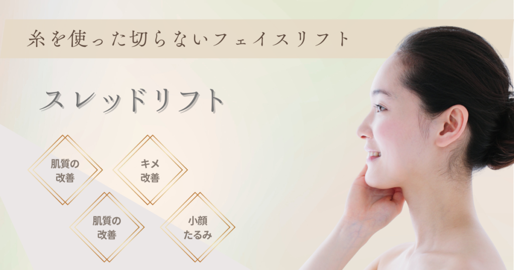糸リフト(スレッドリフト)は、医療用の糸を皮下に挿入し、たるみにアプローチする治療です。切開を伴うフェイスリフト手術とは異なり、メスを使わずに行うため、ダウンタイムや身体への負担を抑えながら治療を行える点が特徴です。