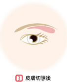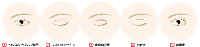 眉毛の下のラインにそって皮膚を切開し、たるんだ皮膚を除去して、まぶたの形を整えます。