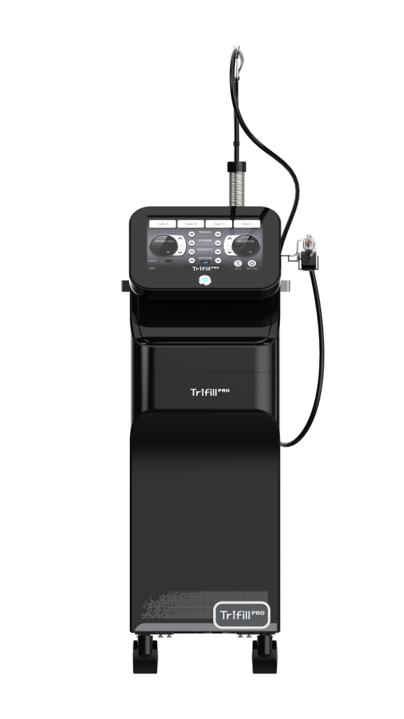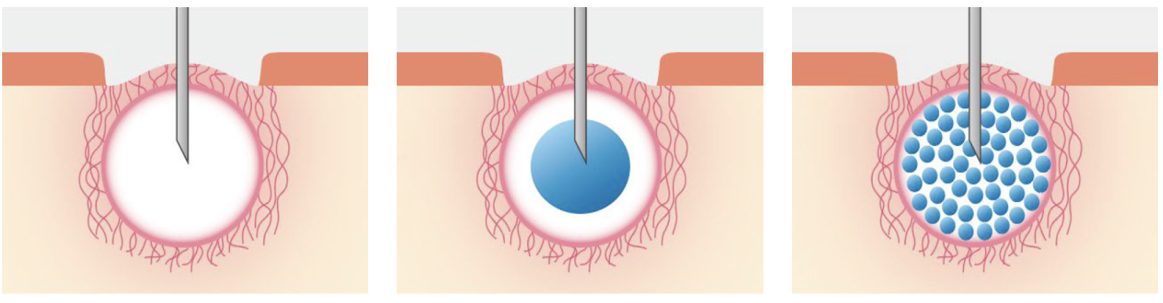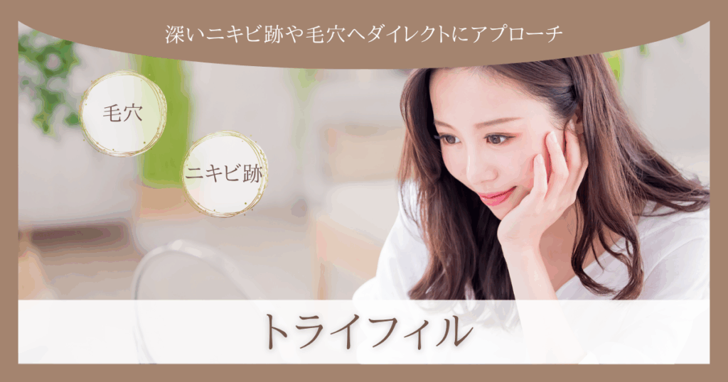 トライフィルプロは、炭酸ガスと美容成分を特殊な針で注入し、肌の内部を再構築する施術です。まず炭酸ガスを注入して固くなった組織を剥離(サブシジョン)し、次に薬剤を注入してコラーゲン生成を促し、最後に再び炭酸ガスを注入して薬剤を均一に広げます。この技術によりニキビ跡やクレーター、シワ、たるみなどを改善していきます。炭酸ガスを使った薬剤を導入していくドラックデリバリーシステムになります。