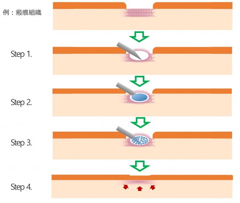 深いしわやニキビ跡は皮膚の奥の方に瘢痕組織存在しておりその組織を剥離させることで正常な組織になる働きかけてくれます。